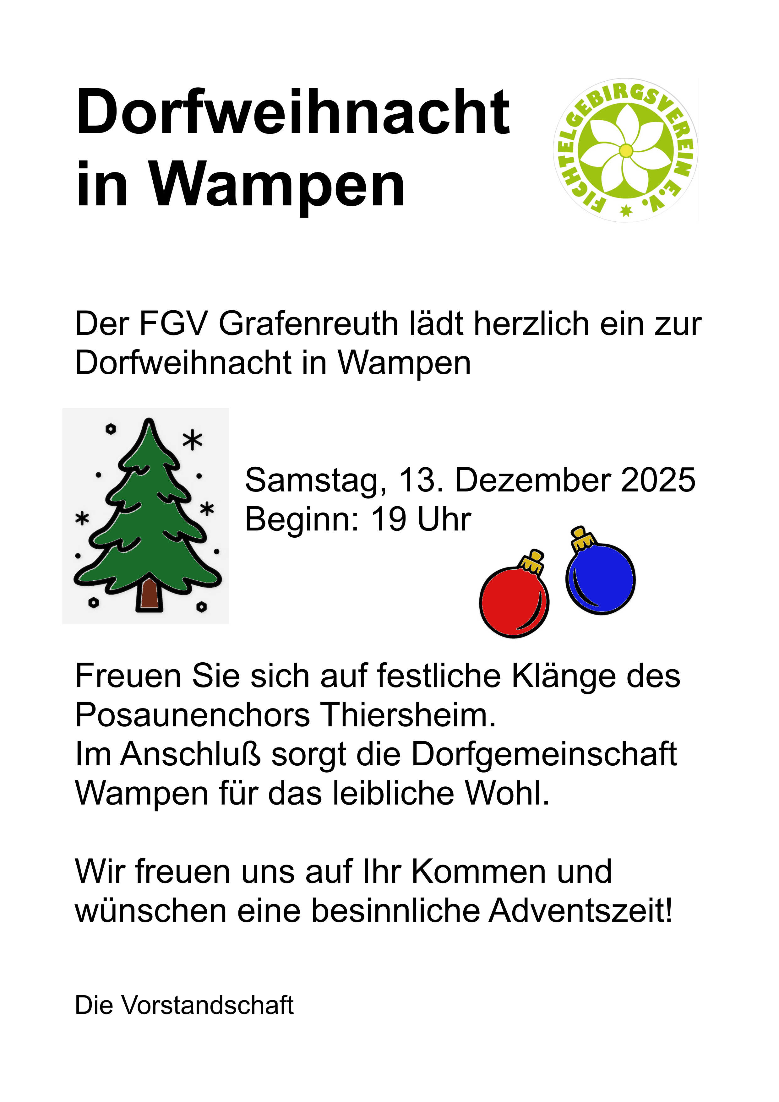 | Sa. 13.12 | FGV-Dorfweihnacht in Wampen. Beginn 19 Uhr (Flyer.jpg) |